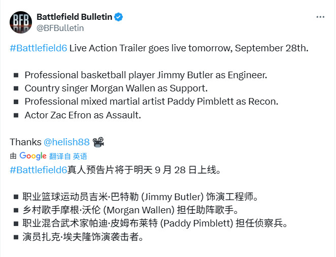 《战地风云6》于2025年9月发布真人发售宣传片,以扎克·埃夫隆、吉米·巴特勒等全明星阵容演绎“名人皮肤”桥段,并通过导弹爆破场景直接嘲讽《使命召唤》系列营销风格。宣传片随后转向写实军事小队,突出本作“动态战场破坏系统”、四大兵种协作及纽约城全面战争体验。游戏确认于10月10日登陆PC/主机平台,并已在TGS 2025开放试玩 。