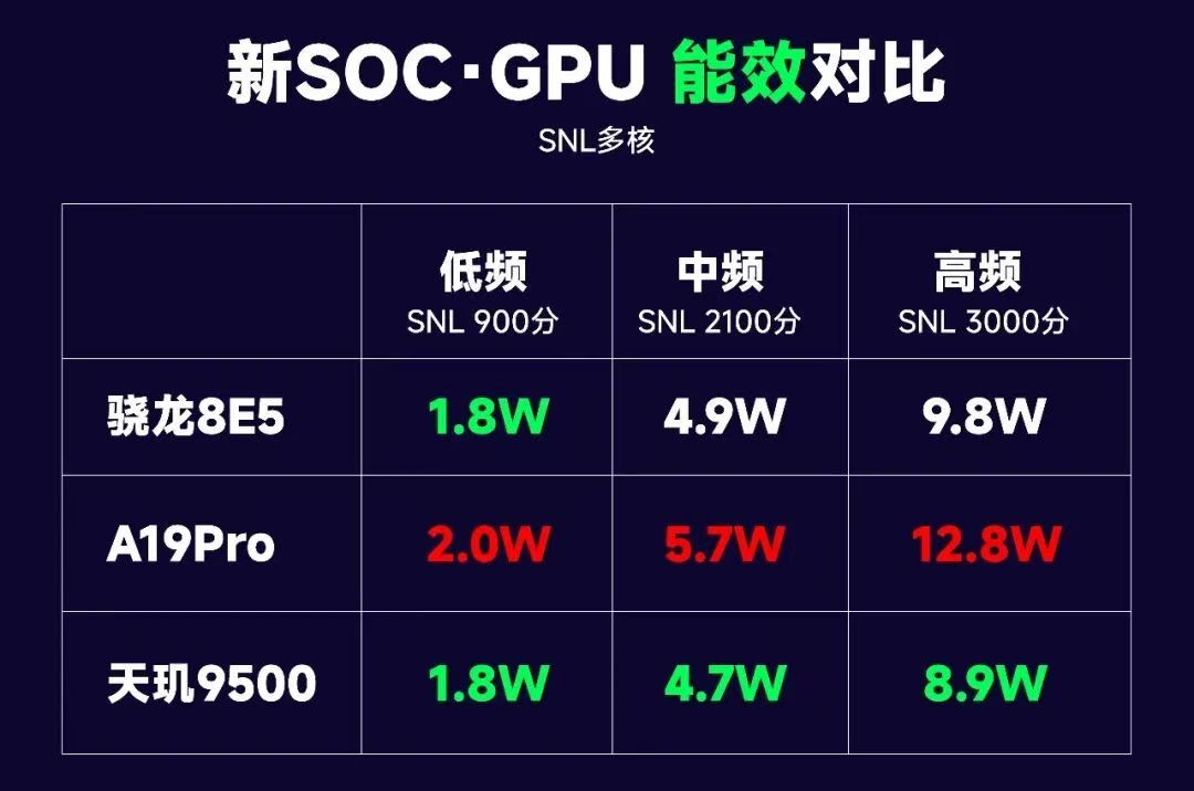 把镜头拉到零售机实测。横向对比当下三大旗舰 SoC,天玑 9500 在 3DMark Steel Nomad Light 中不仅成绩最猛,能效同样亮眼:无论高频、中频还是低频,功耗都更低,整段测试一直压着一众当代旗舰零售机跑。说实话,这对联发科并不稀奇——过去两年,天玑在 GPU 维度常年稳居安卓之巅,扛起了和苹果阵营掰腕子的重任。