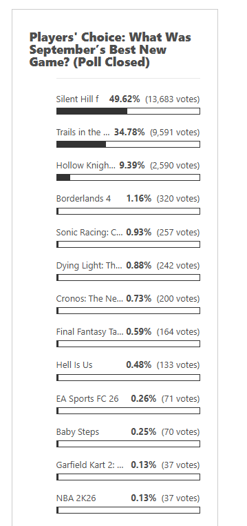 据官方数据显示,在竞争尤为激烈的九月,《寂静岭f》以压倒性优势获胜,共获得13,683票,得票率高达49.62%。经典JRPG《空之轨迹 the 1st》以34.78%的得票率位列第二,而备受期待的动作游戏《空洞骑士:丝之歌》则以9.39%的得票率排名第三。其他参与角逐的游戏如《无主之地4》、《消逝的光芒:困兽》与《最终幻想战略版RE》等,得票率均未超过1%。