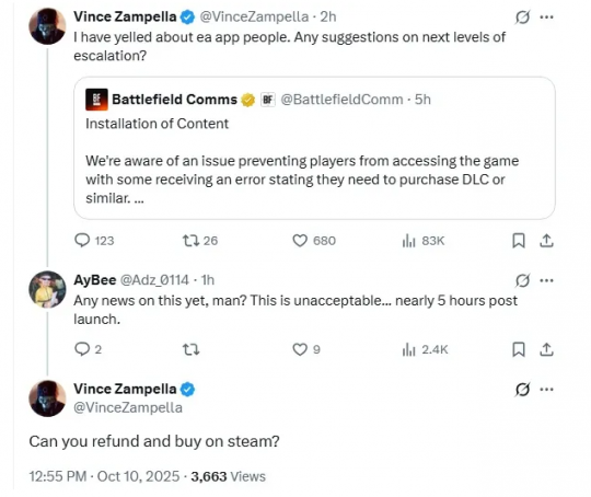 EA表示正在努力修复这个问题,但这对《战地》游戏总监Vince Zampella来说还不够。在X平台上回复一位愤怒玩家时,Zampella给出了任何理性的PC玩家在这种情况下都会给出的建议:“你能退款然后去Steam上买吗?”