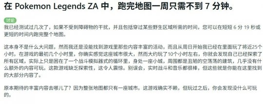 红迪上在宝可梦版块的发帖汇集了诸多提前获取游戏的不满之声。该帖子指出绕行密阿雷市外环一周仅需不到7分钟,最快记录甚至达到6分19秒——直指游戏地图规模过小的问题。