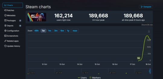 根据SteamDB,《Arc Raiders》还是吸引到了不少玩家测试,Steam同时在线玩家接近19万人,当前在线16.2万人。