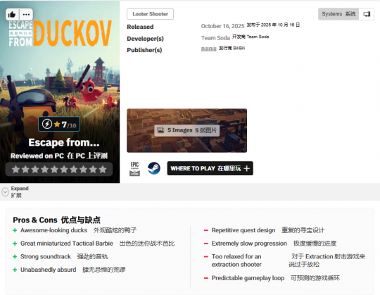 《逃离鸭科夫》在延续可爱画风的同时实现了诸多亮点,但其过长的游戏时长与单薄的刺激反馈形成反差。游戏最显著的缺陷在于借鉴了一款本质存在缺陷、仅凭机缘走红的作品。若能保留《逃离塔科夫》的沉浸氛围并彻底重构任务体系,本有望成为惊艳之作。现阶段这款充满致敬精神的游戏虽不乏趣味片段,却因内容重复性高而逐渐消磨玩家耐心,不过其亲民定价仍可谓物有所值。