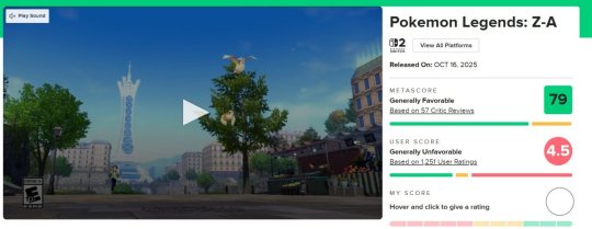 目前该作在Metacritic网站的用户评分仅为4.3分(满分10分)。玩家们纷纷抨击其高达70美元的定价、粗糙的画面表现、缺乏语音支持、狭小地图及重复性玩法等缺陷。一条代表性评论写道:"《宝可梦传说:Z-A》宛如一个被挥霍的良机——画面扁平、贴图粗糙,开放世界空洞乏味,更像是PS3时代重制版而非2025年的新作。美术风格支离破碎,宝可梦与角色设计既不一致也缺乏生机。宣传中充满深度的都市最终只余重复体验。"