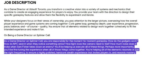 此外,总监还将主导山姆·费舍尔的潜行玩法以及与环境的交互设计。招聘信息来自育碧多伦多工作室,这意味着尽管发生了重大人事变动,该工作室仍然是项目的主要开发方。