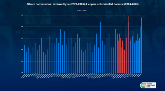 五年来Steam愿望单转化中位数比率保持稳定,未出现显著增长,反映出海量游戏选择对用户决策的影响。此外,游戏评价成为关键因素,好评率低于70%的作品普遍位列转化率榜单底部。