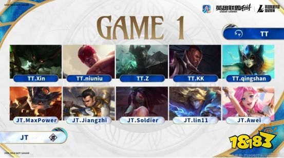 这局比赛开始没多久,JT的双人路抓住了机会,成功完成“线杀”娜美,JT拿到了这一场比赛的“一血”。在前期JT获得优势后,打野选手Jiangzhi针对下路并抓住机会,JT不仅成功“击杀”了TT的双人路,更是很快就拆掉了TT下路的一塔。不过TT也并不示弱,率先抱团试图扳回劣势,在中路抓到了一次机会。不过,JT的反应也很快,凭借着自己前期取得的优势,JT同样抱团还以颜色。但是,TT在这一局比赛中的执行力与抓机会能力要比JT好很多,14分钟左右的时候,TT再次抓到机会打出0换4团战。同时,TT使用大龙做诱饵,引诱JT过来参团并再次打赢团战更是拿下了大龙。拿到大龙后,TT势如破竹,一波带走了JT,拿下了第一局比赛的胜利。
