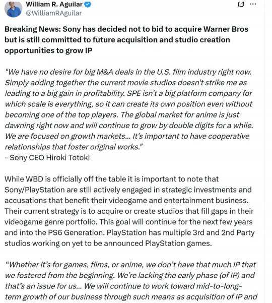 本月22日时,媒体报道了华纳兄弟探索公司以及旗下游戏工作室被挂牌出售的消息。据日经亚洲报道,索尼已经决定不会收购华纳兄弟探索公司,但未来仍然会继续收购和成立工作室,以发展其IP。