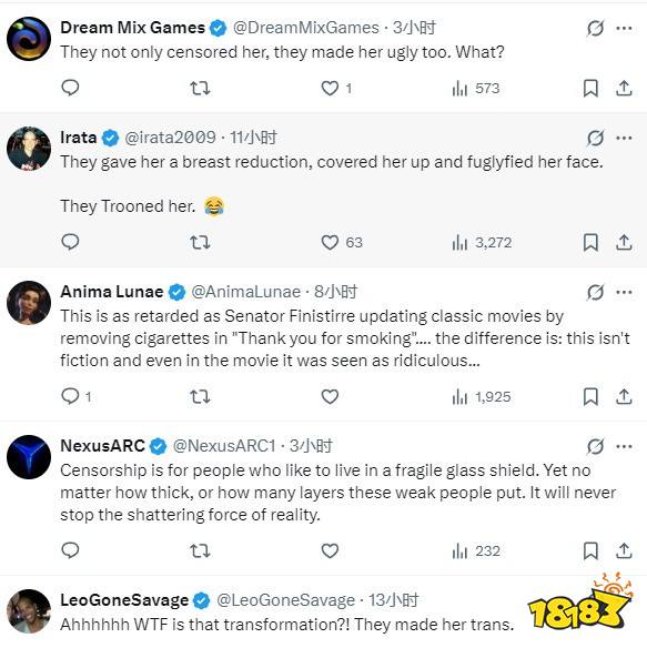 评论区许多人也对和谐表达不满。有人表示:“左边(原版)更符合艺术风格,而右边(重制版)看起来则很平庸。”“左边(原版)设计更好,看起来更有魅力,发型和面部设计都比重制版强。”“他们给她做了胸部缩小手术,还让她变得丑陋不堪。把她的脸弄成了丑八怪。”