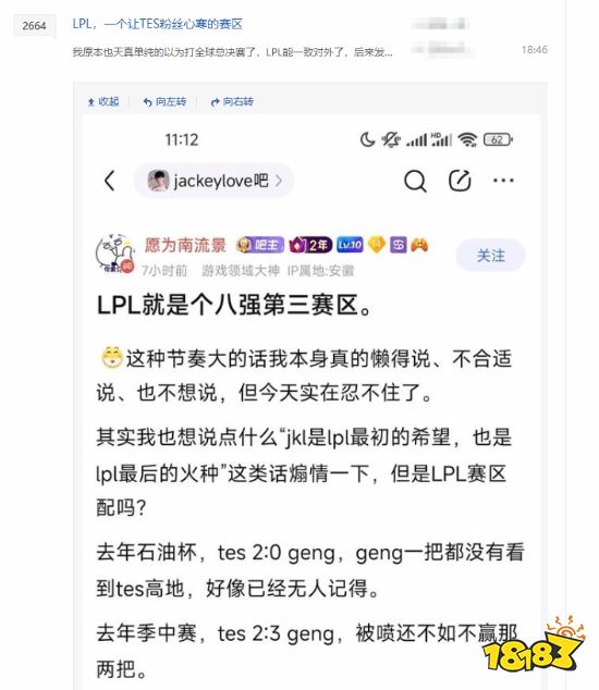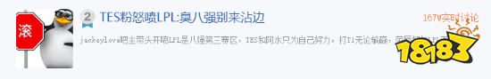 赛后,话题“TES粉怒喷LPL:臭八强别来沾边”冲上了贴吧热议第二。据介绍,jackeylove吧主带头开喷LPL是八强第三赛区,声称TES和jackeylove只为自己努力,打T1无论输赢,荣辱都与LPL无关。