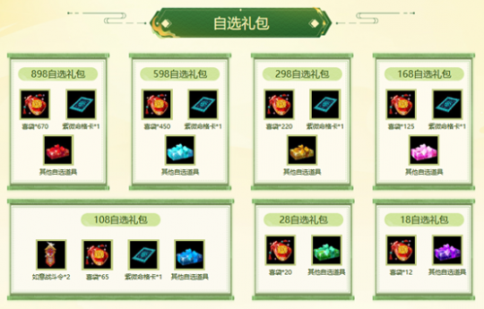 玩家可以根据自己的游戏需求,选择自选礼包商城里的物品,自由搭配同种类的道具,只要所选道具的价值满足相应“自选礼包类型”的要求,当价格达到1800元宝、2800元宝、10800元宝等不同档次时,就可以将所选道具打包成相应的礼包,并且还能获得相应的赠品。