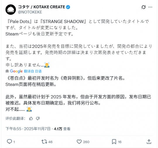 《8号出口》开发商KOTAKE CREATE官推宣布目前正在开发的新作,名称从“ STRANGE SHADOW(奇异阴影) ”更改为“ Pale Dots(苍白点) ” ,Steam页面稍后更新,并宣布延期发售的消息。