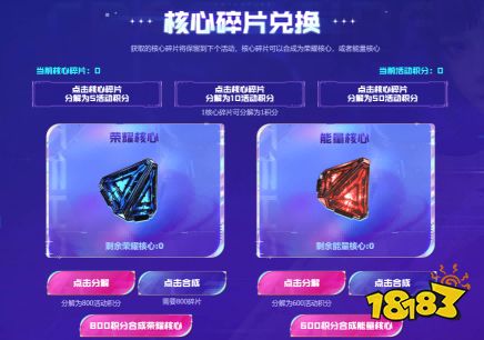 另外CFer可以将核心碎片分解为对应活动积分,当达到800活动积分或碎片时可合成荣耀核心,达到600积分或碎片可合成能量核心。