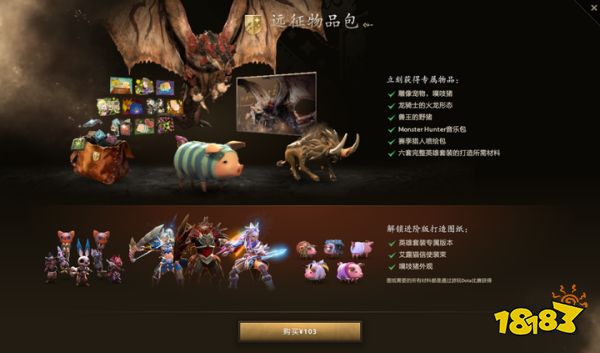 另外,每套套装均包含三种可打造的替代版本,例如龙骑士的“火龙铠甲”可进化为熔岩喷涌的终极形态,只需购买远征物品包即可获得。除了英雄套装,远征物品包还引入了《怪物猎人》标志性宠物系统:玩家可获得一只名为“噗吱猪”的雕像宠物,它会在泉水区闲逛,跟着你四处走动,你出战时它会围绕你的雕像散步。另外还可获得兽王的野猪、怪物猎人音乐包、赛季猎人喷绘包以及六套完整英雄套装的打造所需材料,并解锁进阶版打造图纸:英雄套装专属版本、艾露猫信使装束、噗吱猪外观。此外还有赛季遗世怪物包,会把冰牙龙、黑蚀龙、火龙、雌火龙、干刃龙释放到战场上,十分炫酷。