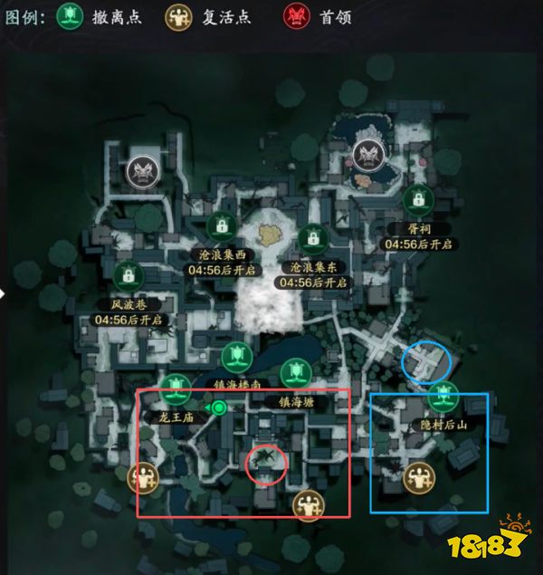 而如果各位少侠出生在蓝框区域内,则需要改换目标为“隐村后山撤离点”上方的院子,大家可以直接沿山路前往院落。
