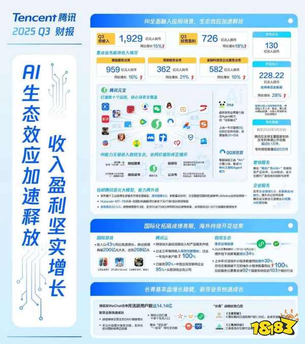 11 月 13 日,腾讯公布了 2025 Q3 的业绩:营收 1928.7 亿元,同比增长 15%;净利润 705.51 亿元,同比增长 18%;增值服务收入 959 亿元,同比增长 16%。