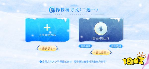 随着“冰雪新歌声”音乐赛事火热进行中,本次赛事为满足不同玩家需求,设置了两种灵活参赛模式。温馨提示,天命者可优先选择上传提前精心录制的作品,这类作品在音质稳定性、内容完整度上更具优势,能更好地展现演唱实力,提升圈粉获赞效率;如若参赛者追求真实现场感,也可通过在线录制音频或视频的方式直接投稿,全方位呈现临场演唱状态,传递你最鲜活的音乐感染力。两种参赛形式均获官方认可,玩家可根据自身优势自由选择。