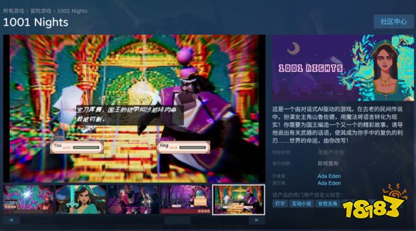 《1001夜》是68款游戏中最特殊的游戏,游戏背景设定在充满阿拉伯风情的奇幻世界,但核心点在于其由AI驱动的动态叙事系统。