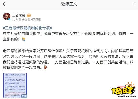 官方表示,《王者荣耀》将不断细化和扩容匹配因子,尽可能快而准的评估玩家实力;持续优化对局全流程,包括处理局前匹配和 BP、局中合作和对抗、局后结算和举报等环节痛点问题;简化复杂评估参数;正考虑排位赛更多依赖外显段位,同时配合一些其他方式,让玩家都能顺利上到自己真实实力匹配的段位。