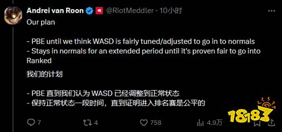 另外Andrei van Roon还在评论区表示,在制作组确认WASD的平衡性被调整完善之前,该操作方式会一直保留在测试服当中,不会实装进正式服,并且在正式服中也将停留一段时间,直到被证明在排位赛中同样公平。