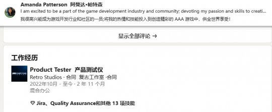 测试员Edwin A.在其主页明确表示,他在Retro工作室参与了《银河战士Prime 4》的测试工作,时长超过两年。另一名测试员Amanda Patterson虽未直接提及游戏名称,但确认在Retro工作室工作两年有余,目前正寻求新机会。两人资料均显示其为合同制测试员,而非全职员工。