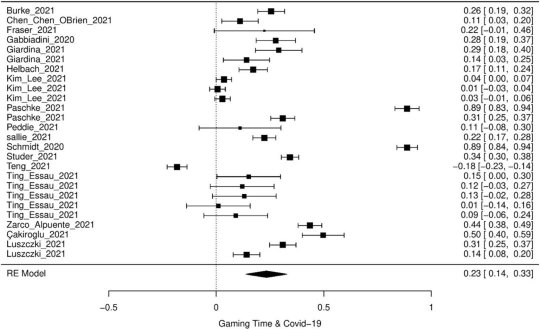 论文列出的游戏游玩时间与幸福感相关性的森林图