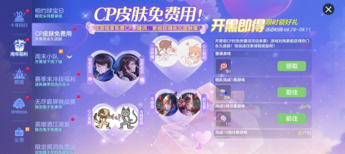 8月29日至9月11日期间,参与组队对战即可领取CP时效关键词!完成对局更能获得永久热门皮肤!包括「爱的么么哒」、「单身贵族」、「单身汪」等多款人气皮肤,机会难得,千万别错过!