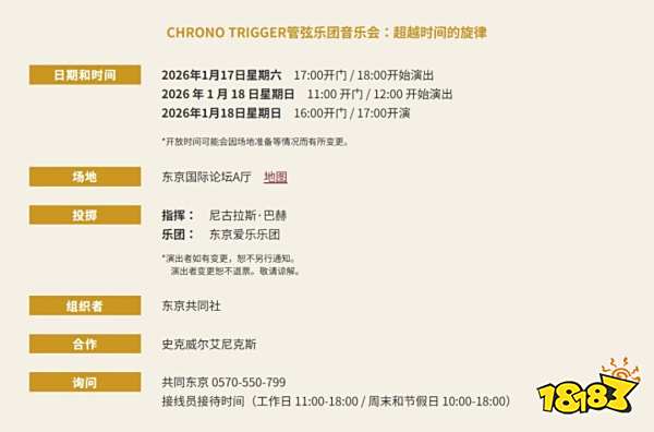 为庆祝《超时空之轮》发行30周年,史克威尔艾尼克斯宣布将于2026年1月在东京举办大型管弦音乐会,由东京爱乐乐团演奏游戏经典配乐,并同步播放游戏场景,门票采用抽选制销售并附赠纪念画册。