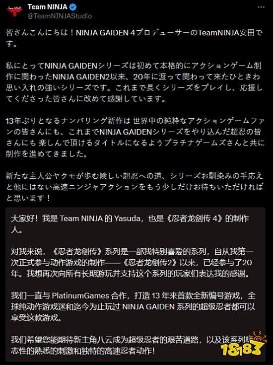 大家好!我是Team Ninja的安田,担任《忍者龙剑传4》的制作人。