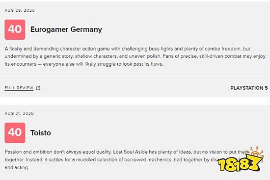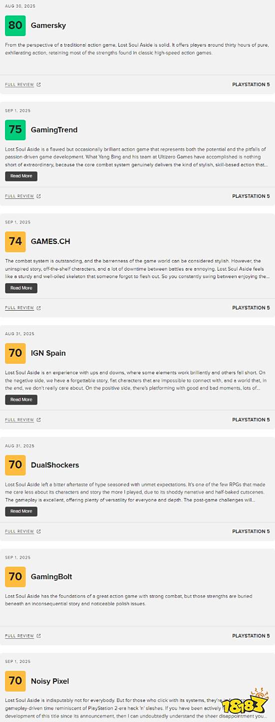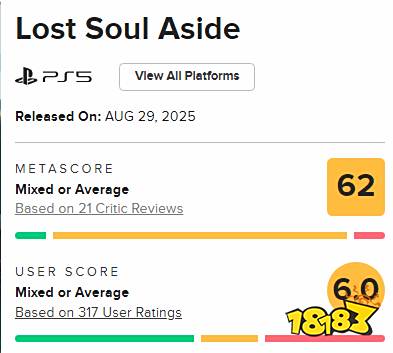 《失落之魂》Metacritic媒体评分正式出炉,基于21家媒体评测均分62分(2好评17中评2差评)。评测普遍认可其战斗系统和动作设计,但批评其剧情平淡、角色塑造薄弱及打磨不足等问题。。