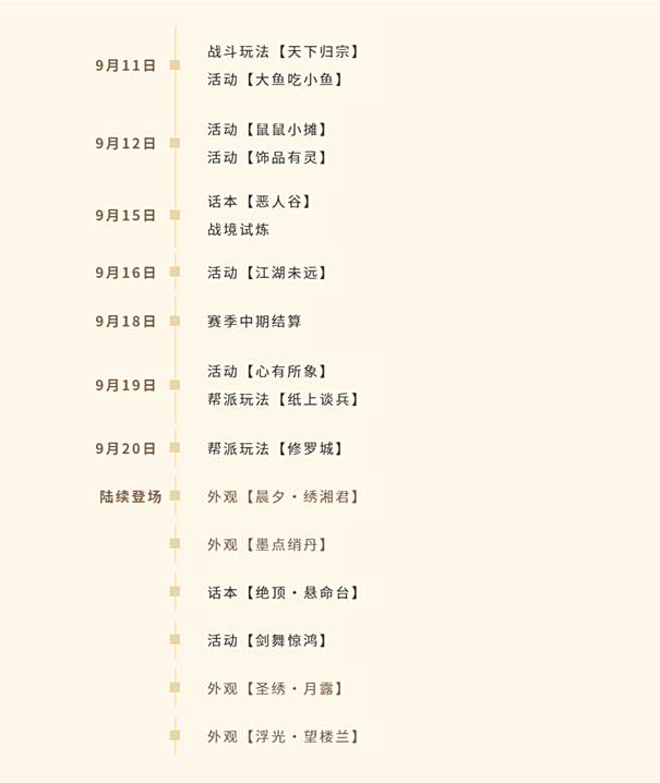 赛季版第四届天下归宗赛会将于9月11日率先燃起战火,本届天下归宗赛事一共持续4天,优胜队伍将获得月灵石红包、金叶子等丰厚排名奖励。