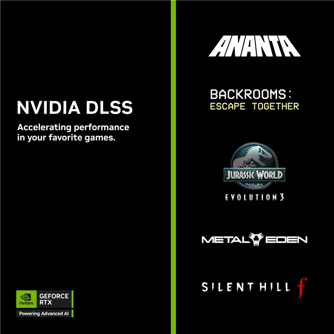DLSS 4多帧生成为《无限大》(ANANTA)、《侏罗纪世界:进化 3》(Jurassic World Evolution 3)、Backrooms: Escape Together和《合金天使:堕入伊甸》(Metal Eden)等游戏带来性能倍增。《寂静岭 f》(SILENT HILL f)本周首发即支持DLSS超分辨率。