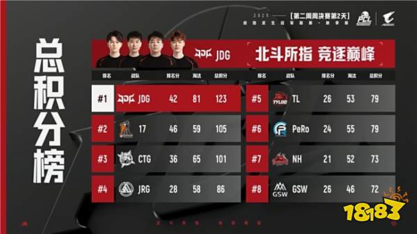 还有一个值得一提的战队则是JDG,不仅有吃鸡成功,还有和17战队1V1上演单挑大戏,令解说沸腾。最后总积分榜本日后仅在第7,但战神榜上,JDG的SpaceMan却是以16个淘汰高居榜首。