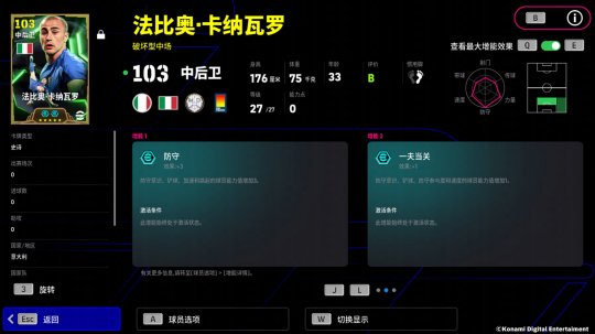 卡纳瓦罗的增能属性为【防守 +3】,让这位金球后卫成为前锋的梦魇!