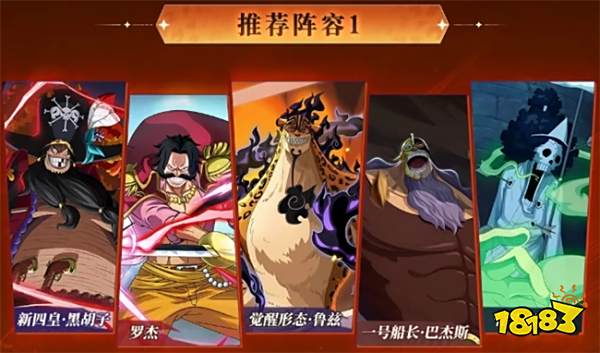 阵容一:新四皇·黑胡子 + 罗杰 + 觉醒形态·鲁兹 + 一号船长·巴杰斯 + 骨头吉