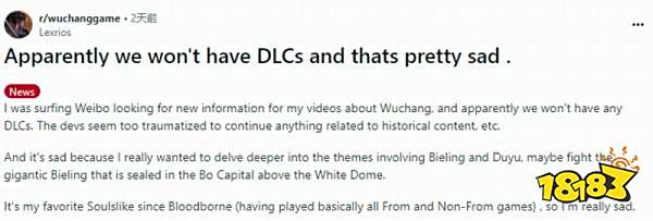 该消息也被转至Reddit论坛,引来众多老外围观。网友Lexrios发帖称,如果《明末:渊虚之羽》没DLC消息是真的话,那将是一件让人很难过的事情。