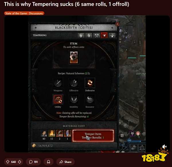 许多人抱怨运气不佳,还有人不满重置次数限制及强制使用卷轴的设计。总体而言,该机制因过度依赖随机数生成、易出现重复词条而饱受批评。更严重的是,每件装备存在淬炼次数上限,若最后一次出现废属性则无法挽回。这种失控感让玩家强烈建议暴雪加入“保护机制”或“撤销功能”,允许回溯已跳过的词条。