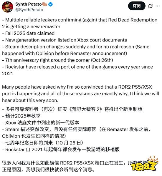 另外,游戏七周年纪念日也即将到来,而且Rockstar自2021年起每年都会发布一款游戏的移植版,所有这一切都为《荒野大镖客:救赎2》的次世代版增添了几分可信度。