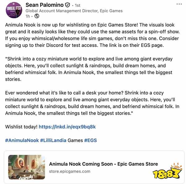 不仅如此,《粒粒的小人国》在海外也收获颇丰。登顶Steam全球免费新游趋势榜,并连续7日霸榜;获得IGN, PlayStation, Epic Games等全球头部媒体、平台的报道和推荐。全球KOL也在游戏pv发布后踊跃响应,有近340名全球KOL(包括3名超百万粉级)主动报名,希望参与内容创作。Epic商店的负责人Sean Palomino更是直接用Linkedin的个人账号进行宣传,称这是一款生活模拟类不容错过的游戏!这一系列反响都说明了业内对产品的期待以及认可,产品具备极高的传播价值。