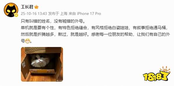 此外,工长君还再次分享制作理念:“只有叫错的姓名,没有喊错的外号。单机就是要有个性,有特色拒绝缝合,有风格拒绝白瓷娃娃、有叙事拒绝通马桶,然后就是折腾越多,熬过,就是越好。感谢每一位朋友的帮助,让我们有自己的外号。”