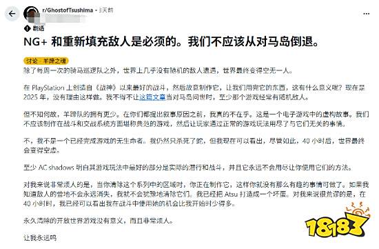 2025年10月下旬,《羊蹄山之魂》通关后开放世界敌人消失问题引发玩家社区激烈争论,支持方要求新增敌人刷新与New Game+模式以延续战斗体验,反方则认为单机游戏叙事完整性高于无限玩法,凸显Sucker Punch在设计哲学上面临的沉浸感与可重玩性平衡挑战。