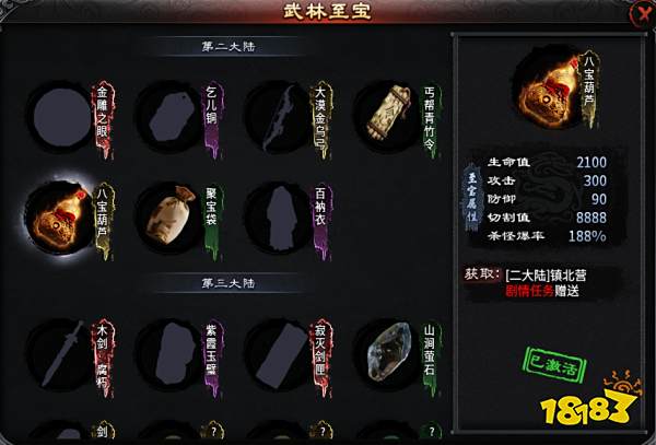另一个“武侠特色”是“武林至宝”系统,就像那种江湖上赫赫有名,人人都想寻找的神兵利器或有奇妙能力的宝物一样,《千击武侠沉默》中也有这样神秘的存在,同样通过特殊的剧情任务、刷怪或部分充值活动来获取,它不但能给玩家带来大量属性加成,还有一些在指定大陆上能够激发的特殊效果。