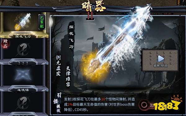 在武侠小说里,很多高手都会使用暗器,游戏中也单独加入了一个暗器系统,需要用任务和刷怪获取的特殊道具去解锁不同的暗器。不过比小说中更强悍的是,这个暗器不需要瞄准甚至不需要手动发射,冷却CD之后就会自动射出,对敌人造成大量伤害,比较适合对战中小boss,如果要打世界boss的话,暗器的伤害会相应降低。