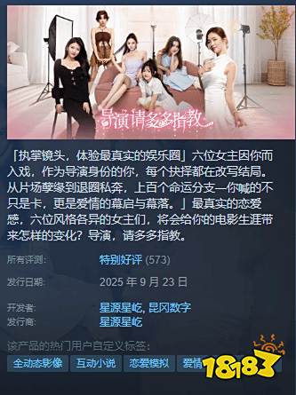 2025年9月23日,真人互动影游《导演,请多多指教》在Steam平台发售,首周获93%好评率(573份评测),游戏以娱乐圈导演模拟为核心,采用全真人实景拍摄,提供六位女主上百条剧情分支路径,虽存在UI优化空间及轻微BUG,但凭借沉浸式职场叙事与多结局系统成功打开细分市场。