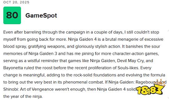 即使我在短短几天内就通关了主线,我依然忍不住想要继续玩下去。《忍者龙剑传4》是一场残酷而华丽的盛宴——夸张的血花、爽快的武器手感、极致的动作美学一应俱全。它一扫《忍者龙剑传3》的阴霾,让我再次渴望更多角色动作游戏,也让我怀念起当年《忍者龙剑传》、《鬼泣》和《猎天使魔女》称霸动作领域的时代。每一处改动都意义重大,它在坚实的基础上进一步进化,将那套惊人的战斗系统发挥到极致。如果说《忍者龙剑传外传:怒之羁绊》和《超级忍 反攻的斩击》还不够的话,那么《忍者龙剑传4》正式让2025年成为“忍者之年”。