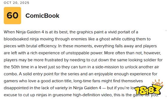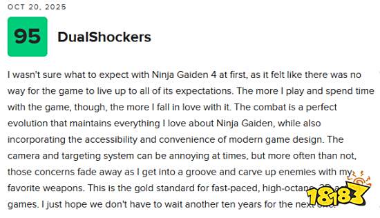 2025年10月21日,《忍者龙剑传4》正式发售,Metacritic媒体评分解禁,Xbox Series X版均分83分(36家媒体),PC版82分(22家媒体),PS5版81分(22家媒体)。DualShockers给出95分满分盛赞战斗系统进化,IGN、GameSpot等多数媒体肯定其高速战斗的爽快感与视觉表现,但普遍指出剧情深度不足、后期内容重复及Boss战设计不稳定等问题,形成“战斗极致爽快,叙事略显单薄”的评价共识 。