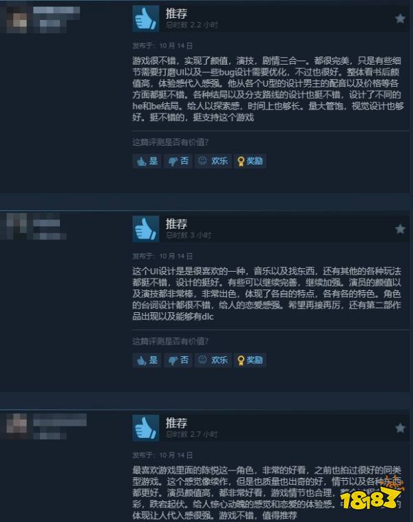 给予好评的玩家认为,本作实现了颜值,演技,剧情三合一,游戏剧情量大管饱,多种路线和不同结局让玩家探索欲很强。美女都很好看,颜值很高各有特点,角色的台词设计都很不错,给人的恋爱感强。