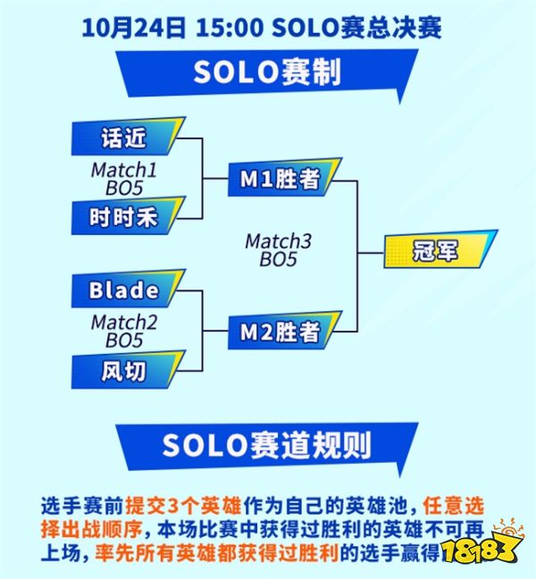 赛制:采用Bo5选3车轮的方式,选手赛前提交3个英雄作为自己的英雄池,任意选择出战顺序,且本场比赛中获得过胜利的英雄不可再上场,率先使用所有英雄都获得过胜利的选手赢得比赛。