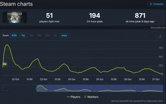 近日《止痛药》新作发售,该作在Steam上没有任何热度。据SteamDB数据显示,游戏同时在线玩家峰值仅为871人。