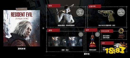 豪华版价格为398元/568港元,除了游戏本体外,还有格蕾丝的“蒂米特雷斯库”等5套服装(有人猜测包含里昂的服装)、“末日”滤镜、2个“浣熊先生”挂件、4种“末日”武器外观、“浣熊市经典”音乐音效、文件“来自1998年的信”等道具。